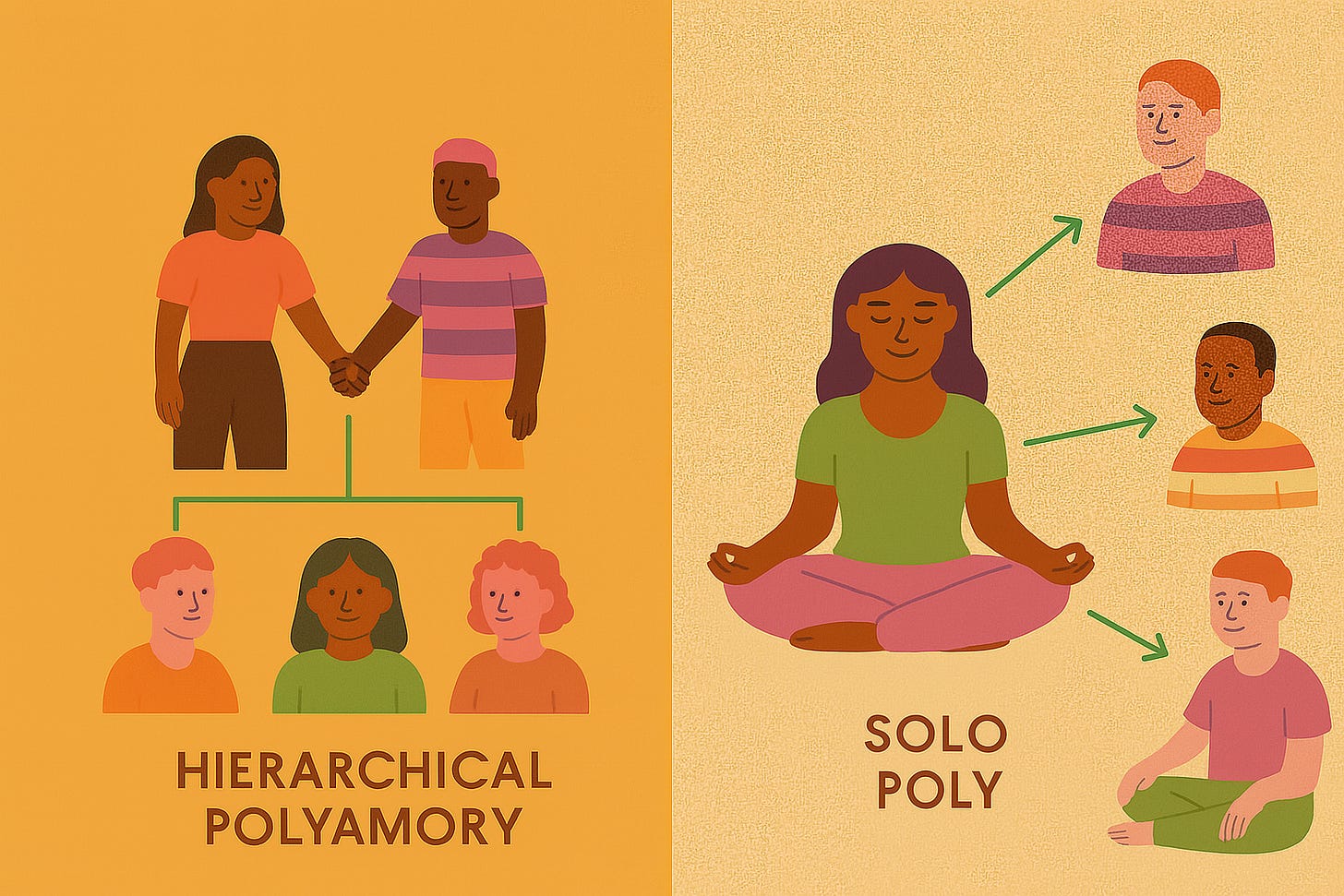 My own path has included many iterations over the last 12+ years: Monogamy as the default only option until my 20s → Monogamish play party exploration with a partner → A quad-based open relationship → A hierarchical triad where I held a secondary role → Hierarchical polyamory → And now, a more egalitarian approach that feels aligned for my 40s—one that honors the inherent hierarchy of being married to my nesting partner, while still allowing spaciousness for close metamours and a wider polycule I truly adore.